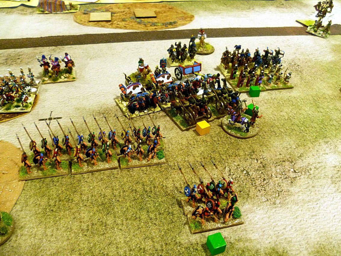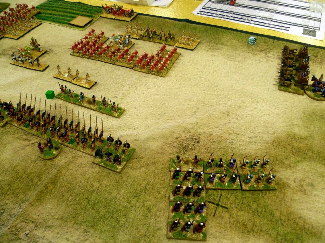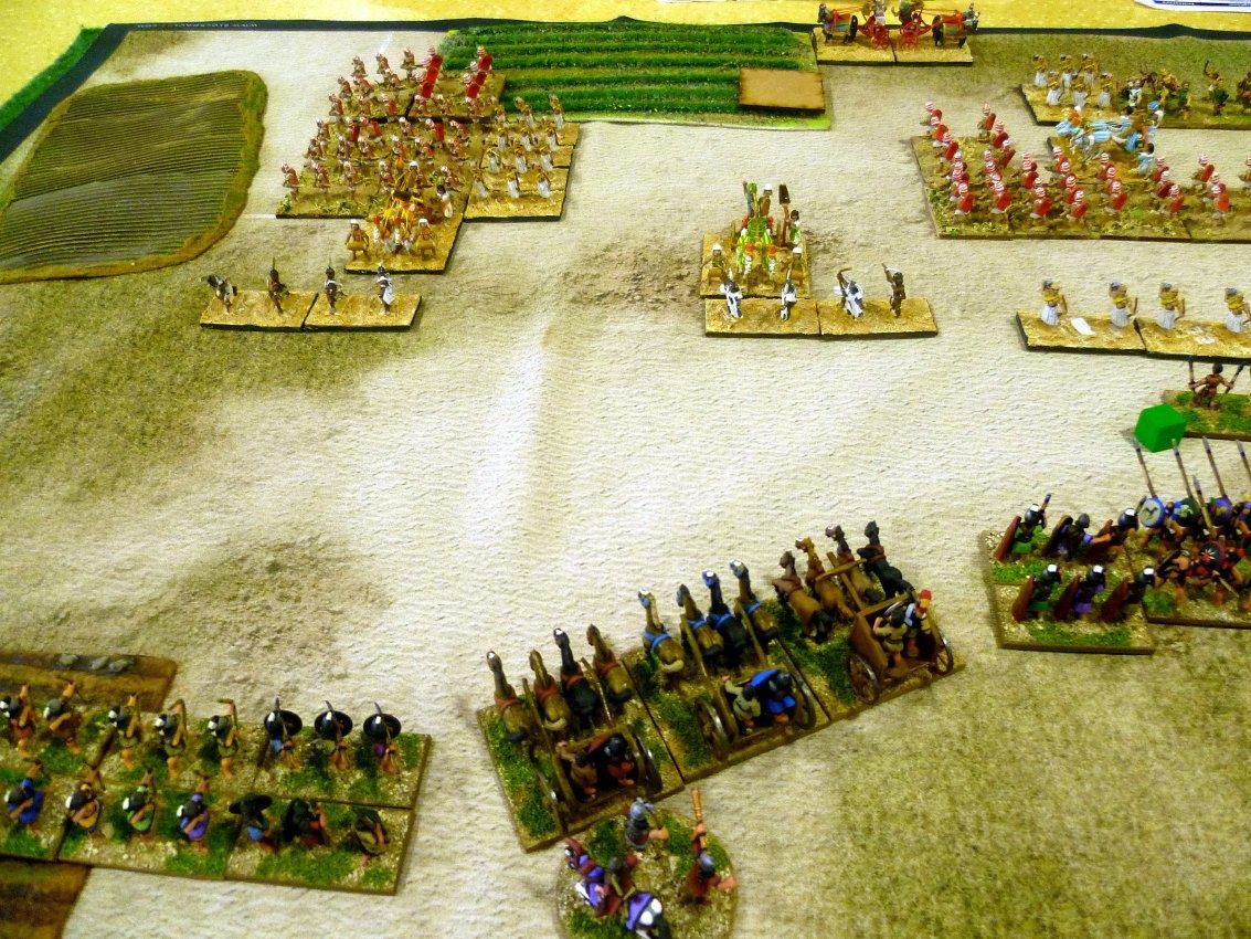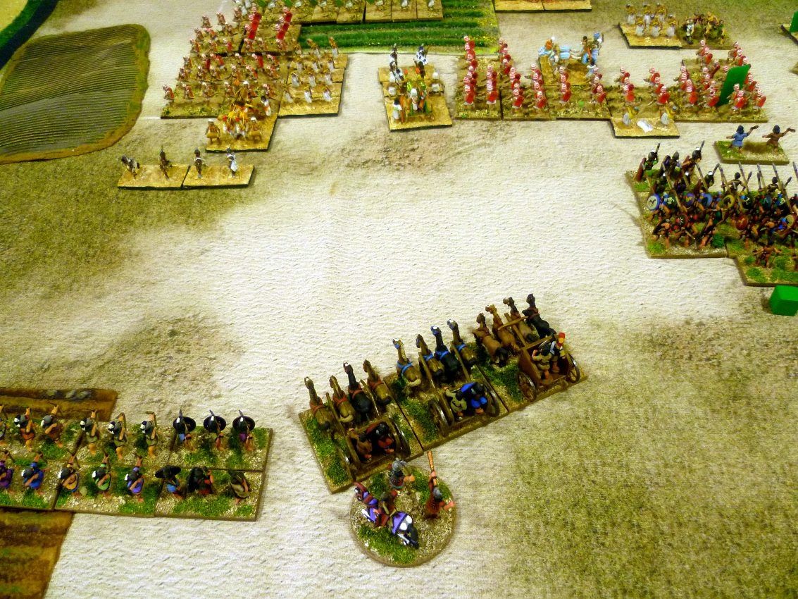 Son corps central se révèle, il est formé de fantassins médiocres qui trouvent refuge dans l'unique terrain présent de son côté.... toute son armée s'est concentrée sur 1/4 de table.... le corps central continue son avance. Mes chariots attaquent les quelques troupes qui tentent de les ralentir. Elles se feront bousculer sans trop de dégâts laissant libre accès au bagages..