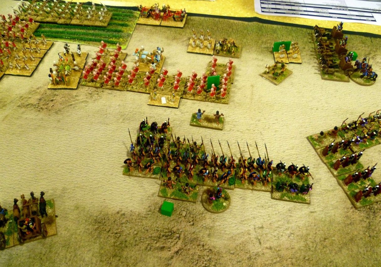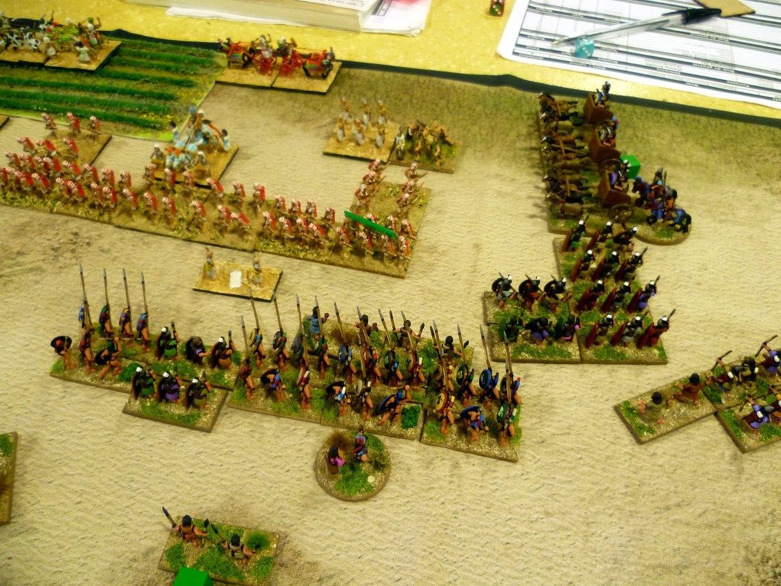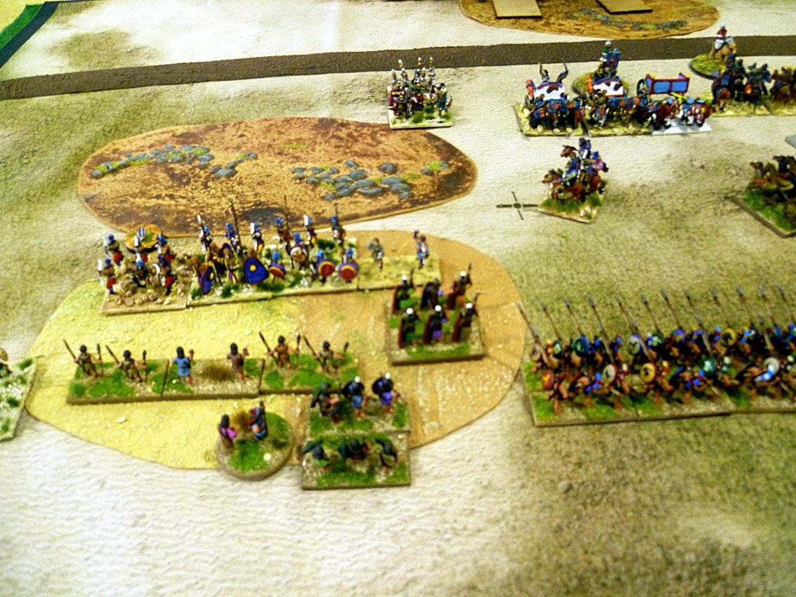 Son corps central se révèle, il est formé de fantassins médiocres qui trouvent refuge dans l'unique terrain présent de son côté.... toute son armée s'est concentrée sur 1/4 de table.... le corps central continue son avance. Mes chariots attaquent les quelques troupes qui tentent de les ralentir. Elles se feront bousculer sans trop de dégâts laissant libre accès au bagages..
