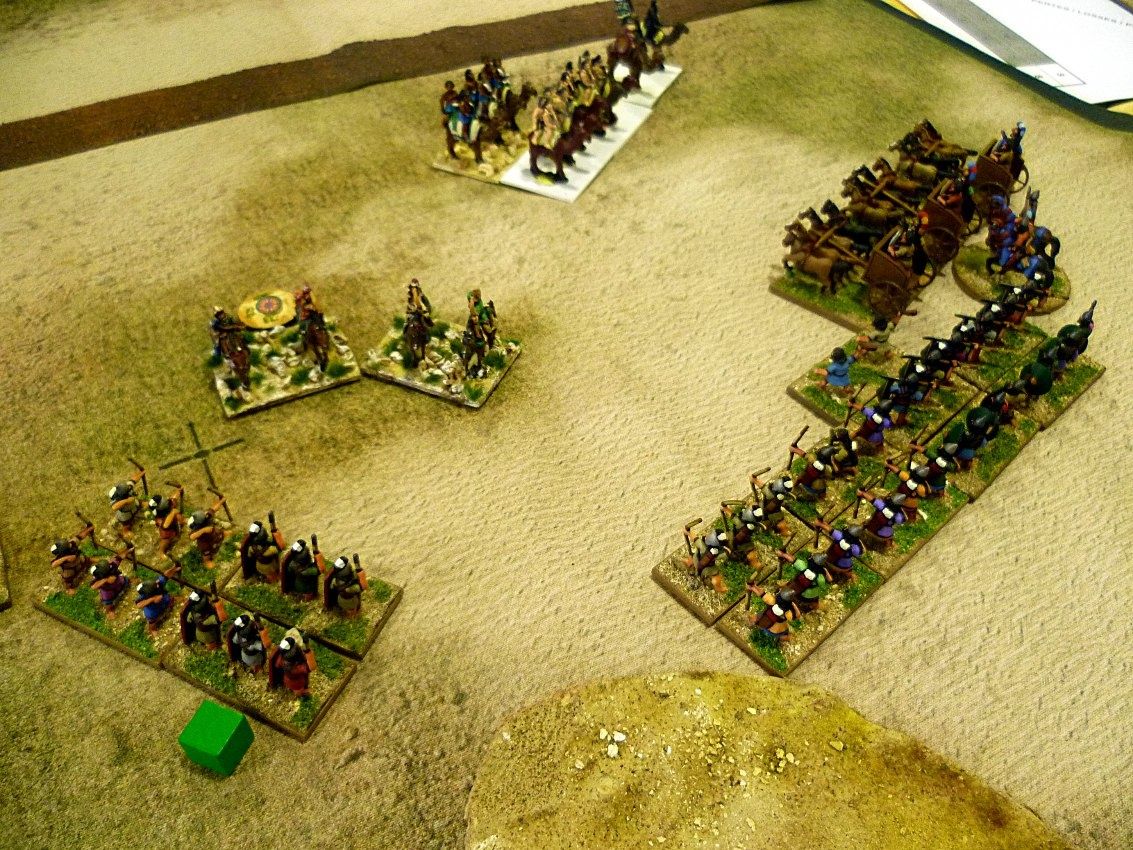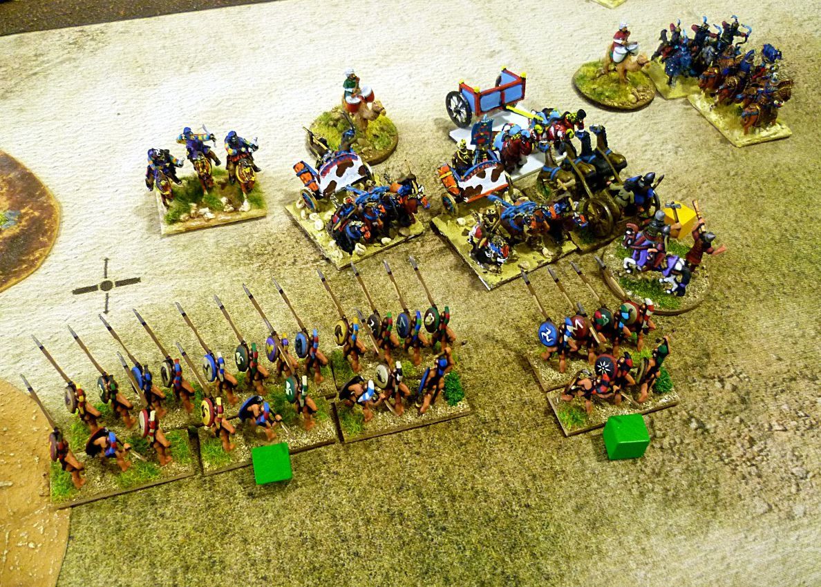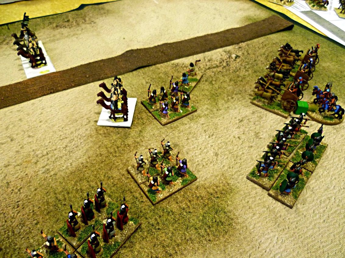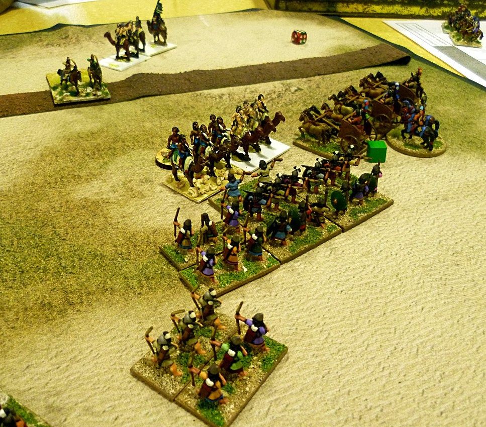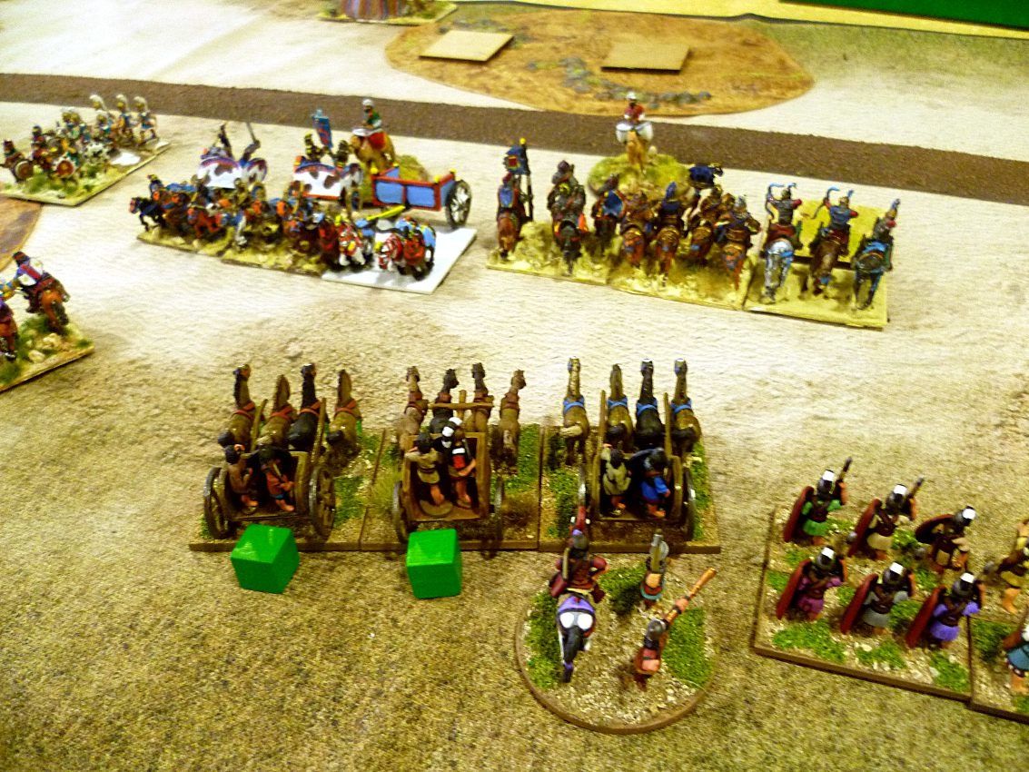 Au centre, mes chariots élite soutenus par les lanciers moyens et archers de leur corps et les lanciers lourds du corps de l'aile gauche, attendent le choc des chariots lourds et cavaliers arc Assyriens...