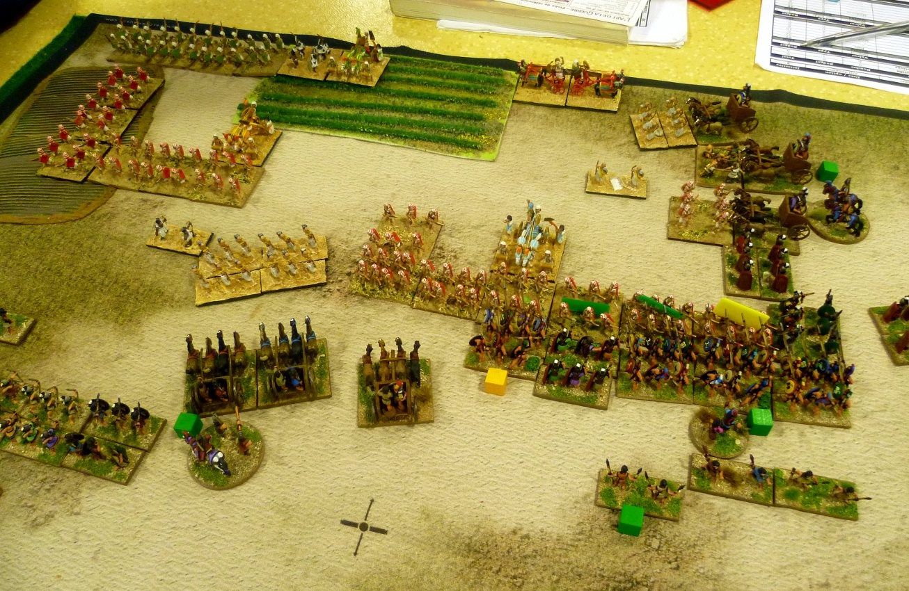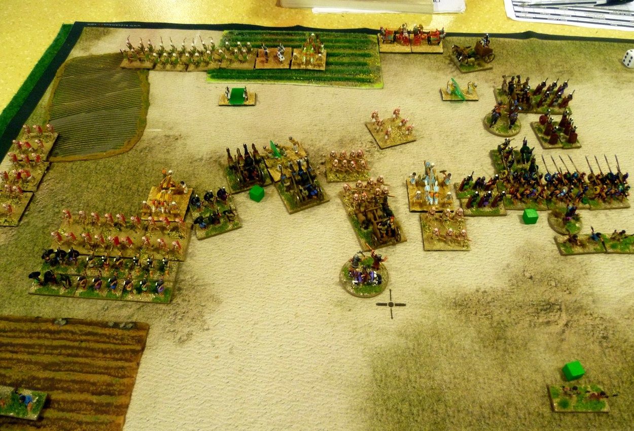 Mon corps de l'aile droite se retrouve libre de ses mouvements et entreprend un mouvement tournant pour menacer les flancs de son corps principal qui va manoeuvrer pour retarder le choc inévitable....