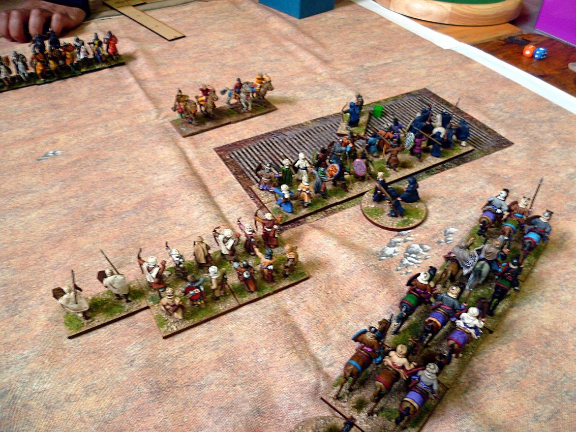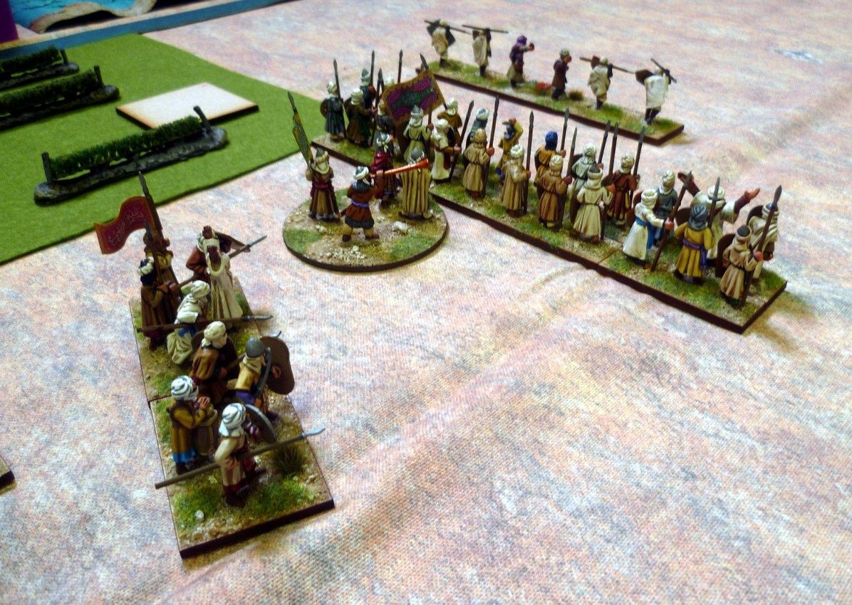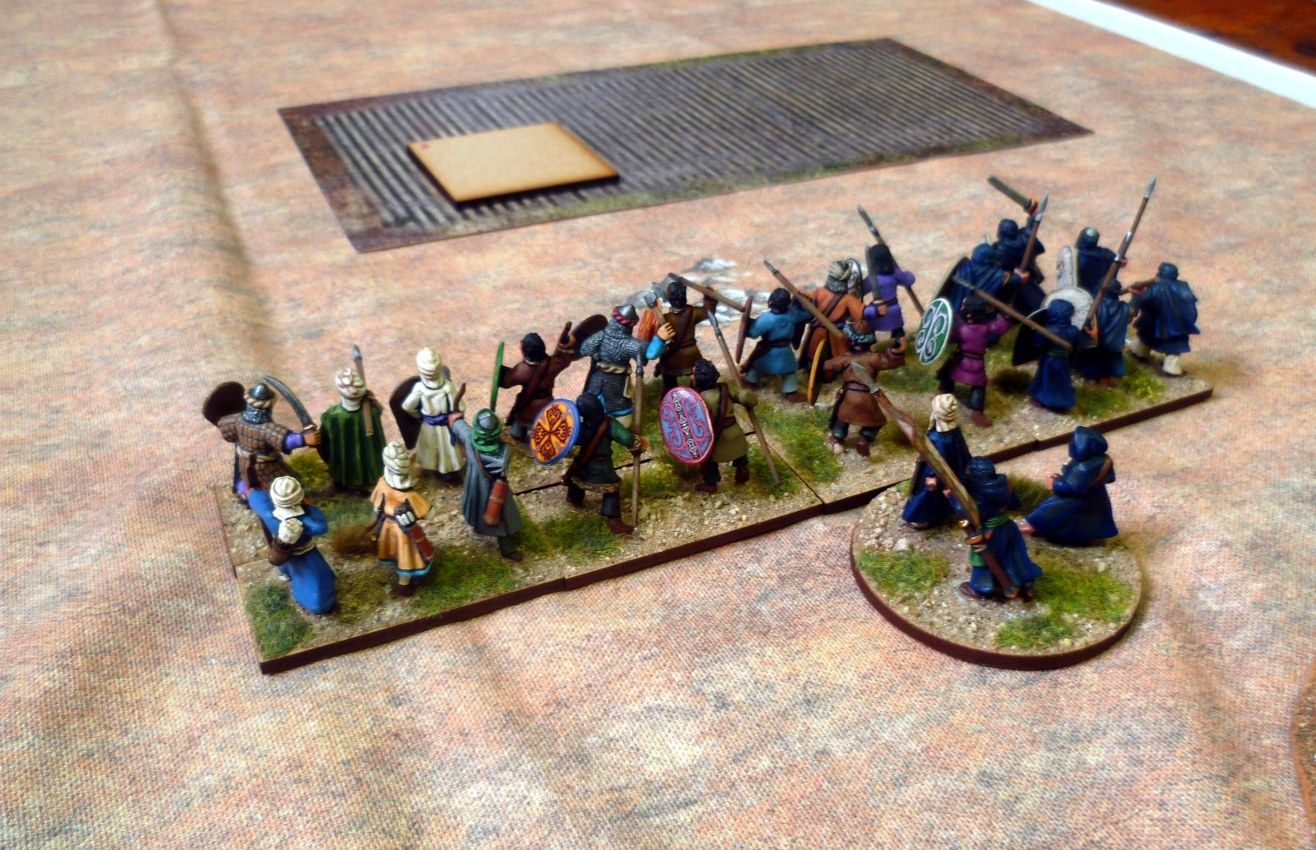 Pour participer, j'emporte la seule armée que je possède, les Arabes. Je choisis de la décliner en "Arabes Abbassides". Dans cette poule "ouverte", je me doute des difficultés qui m'attendent : des combinaisons de piquiers et éléphants pour les joueurs ayant choisi des armées antiques et des chevaliers et troupes lourdes pour ceux qui auront choisi les armées médiévales..... un vrai challenge. Je compte sur la "souplesse" de l'armée et une cohésion de 27 pour ne pas perdre trop rapidement.