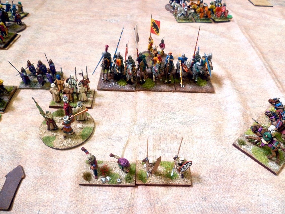 Sur l'aile gauche, la menace se précise. Les chevaliers élite, soutenus par leur infanterie, attaquent les lanciers lourds arabes. Les fantassins légers qui les couvraient sont obligés de fuir.